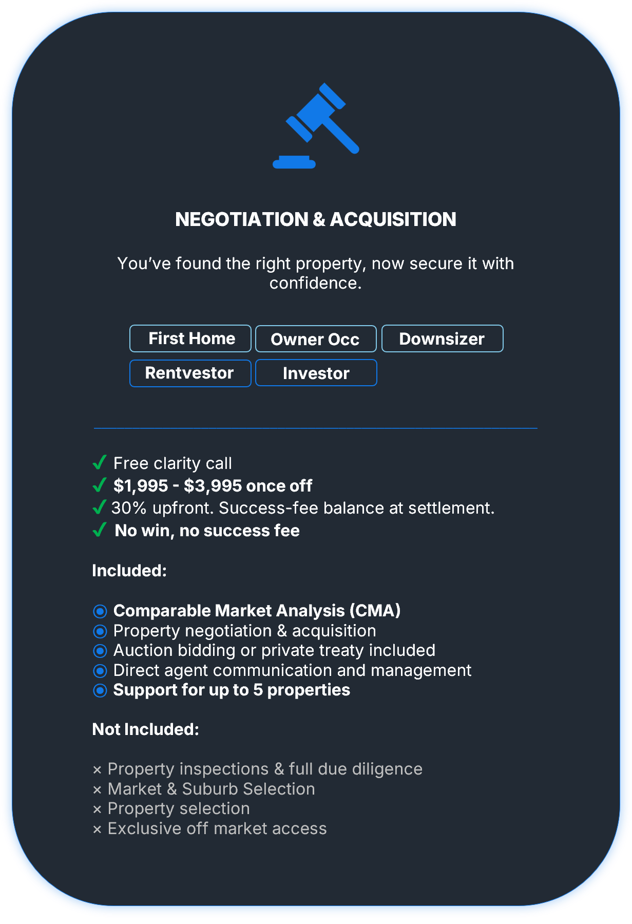 Whether you’re securing your next home or building a portfolio, we give you the critical insights behind the data that truly matters. We identify high‑quality opportunities, highlight the red flags others miss, and support you through a structured process from search to settlement — including expert negotiation and auction strategy to help you secure the right property on the right terms.