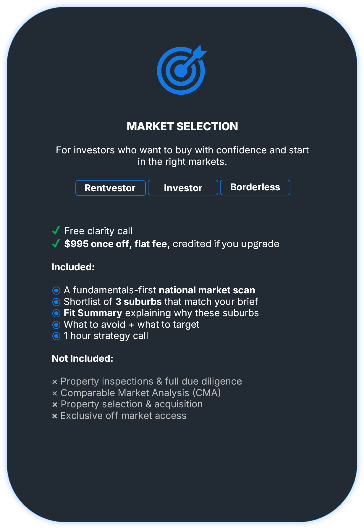 We focus on identifying investment‑grade markets, suburbs, and assets, helping investors and rentvestors build high‑performing portfolios with disciplined strategy and long‑term clarity.